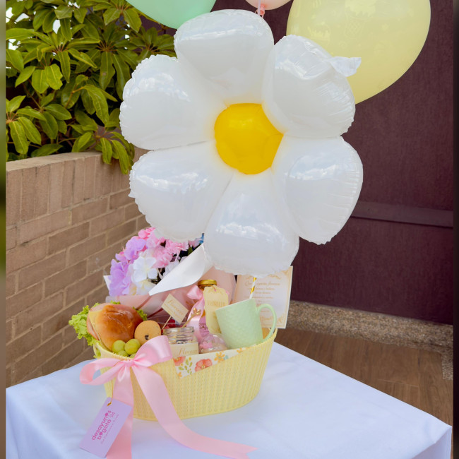 * Globo en forma de flor color blanco acompañado con dos globos con helio en tonos paste.